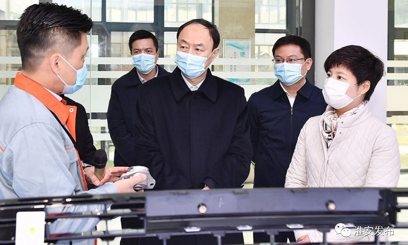 2月17日,江苏淮安市淮阴区委书记董国喜来我公司调研,深入了解公司的复工复产和疫情防控等情况。淮安高新区党工委委员、管委会副主任桑绍淮等陪同调研。